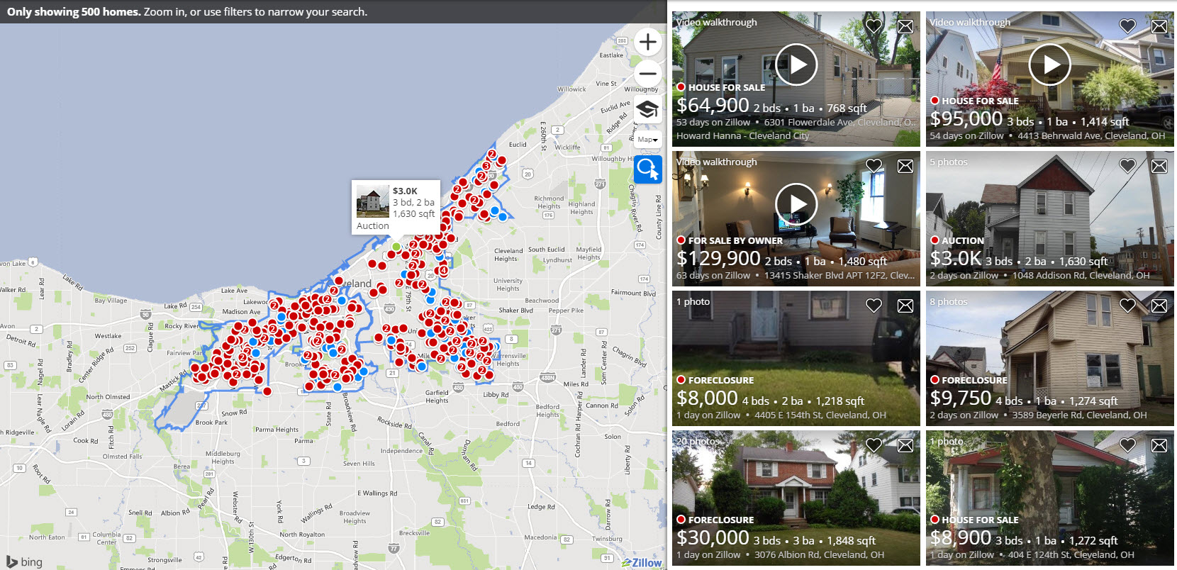 The New York Times reports that just a few miles from the Cleveland downtown, recently getting a $50 million make-over, hundreds of dilapidated homes are getting torn down. The long shadow of the predatory lending of in the run-up to the 2008 global financial crisis resulted in blighted neighborhoods. The number of residents in the Cleveland metro area is down from 1 million to about 400,000. Check out all the red dots I got from real estate site zillow.com.