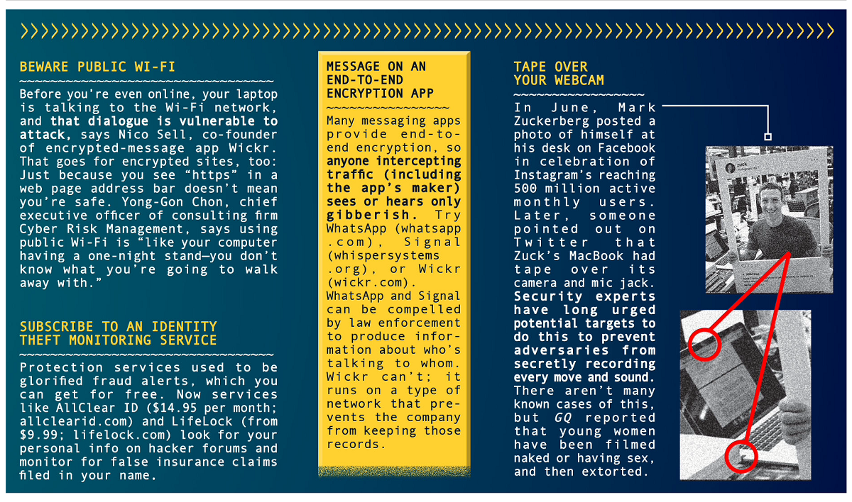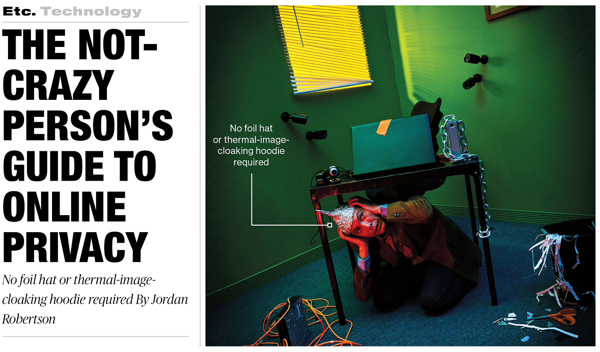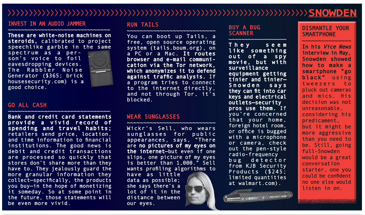 Here is a set of panels from Bloomberg Businessweek that outline the ‘state of the art’ of measure that one can take to be secure on-line. There is a new Jason Bourne movie out, and I’m sure some of what’s described in here will feature in it. I guess if you are Edward Snowden, you have your audio jammer and bug scanner, you go all cash, run Tails (no Windows! or Mac OS!), wear sunglasses all the time in public. Man! If you”re not paranoid before taking all these measures, they are sure to get you there. And does it help? As Joseph Heller of Catch-22 fame said: ‘Just because you’re paranoid, it does not mean that nobody is tracking you’. Even so – I guess I will try to stop using wi-fi at the airport, change my passwords more often, and clear my browser cookies from time to time.