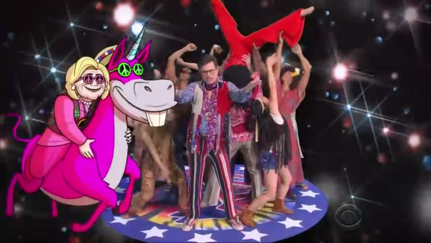 Stephen Colbert in his psychedelic sixties get-up, and along comes the Democratic party donkey (made into a unicorn), with Hillary in pantsuit and pearls. And how about the ‘peace’ sunglasses that both are wearing?