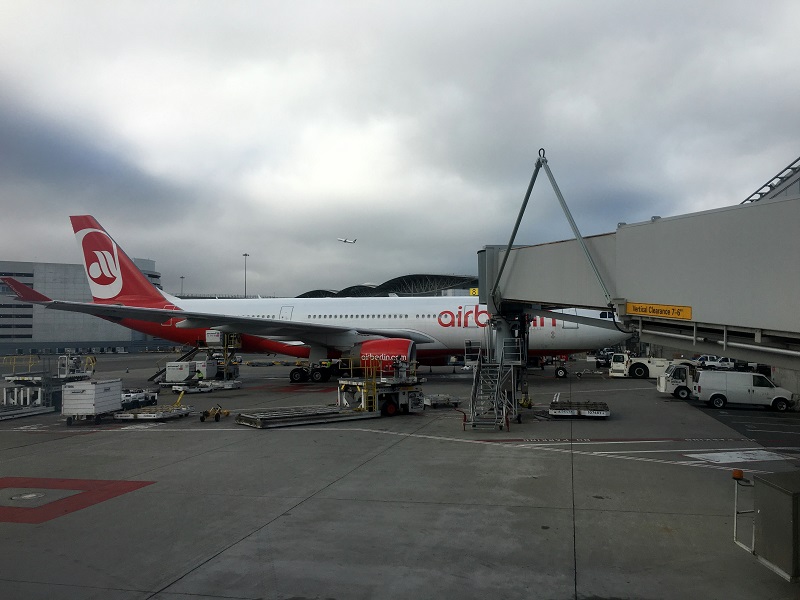 There’s an antique porcelain exhibit in the International Terminal in SFO. This platter depicting the Taj Mahal was made in 1824. (I love porcelain). The Taj Mahal itself was commissioned in 1631 by the great Mughal emperor Shah Jahan to commemorate his deceased wife. The Taj took more than 20 years to build and is one of the most celebrated architectural structures in the world. (I love architecture, as well!).This is at San Francisco airport at 6 pm today. I have just settled into seat 9A on Alaska Airlines’s airplane, and I’m checking out the Air Berlin jet at the gate next door. I looked up the flight and : it makes non-stop flights from San Francisco all the way to Düsseldorf, Germany (flight time 10 hrs and 40 mins).