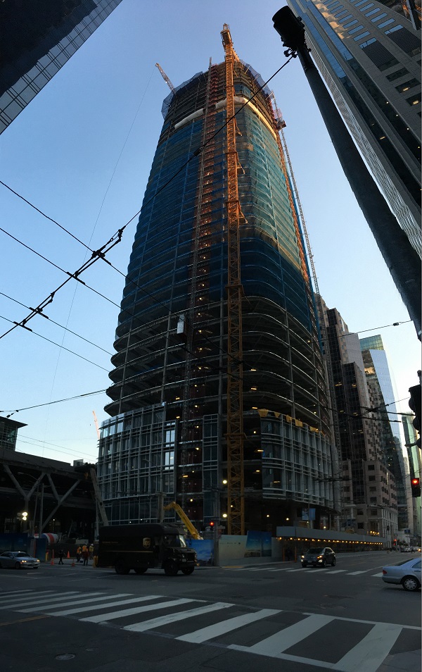 There is a skyscraper construction boom going on in and around San Francisco’s financial district. This is 181 Fremont, with a floor count of 54 and a height of 802 ft (244m). The Salesforce Tower that is under construction nearby will boast 61 floors, and stand 970 ft (295m) tall.