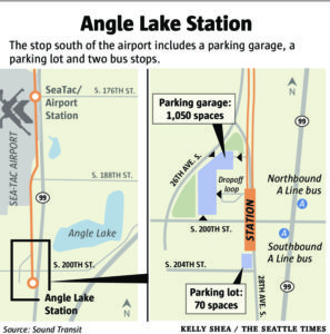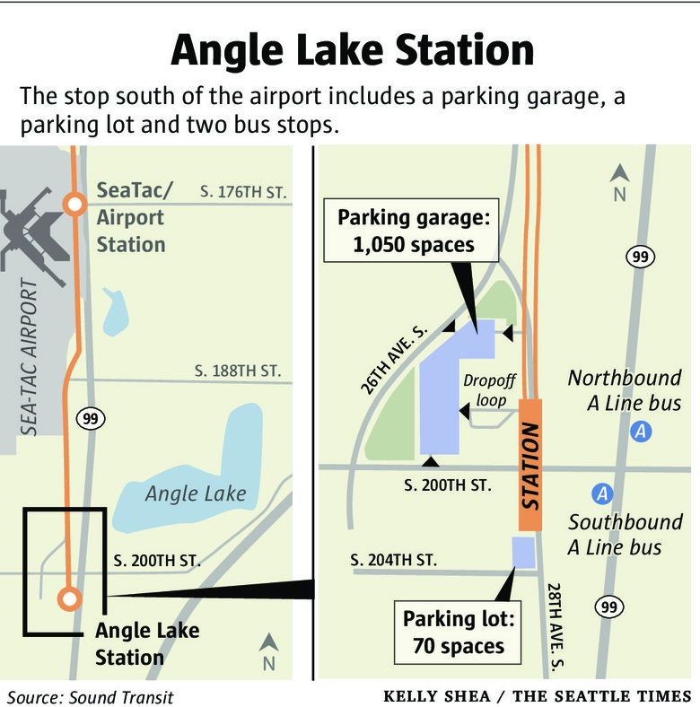 (From the Seattle Times) Angle Lake is an L-shaped lake close to Sea-Tac airport.Here is a view from an upper floor of the parking garage out to the station platform.And here is the brand-new parking garage. A Southwest Airlines jet has just taken off from Sea-tac airport close by.