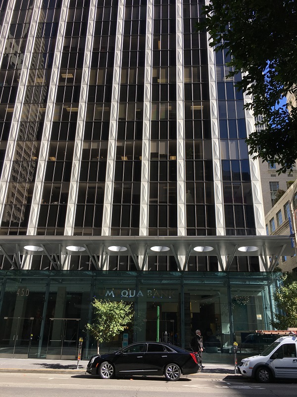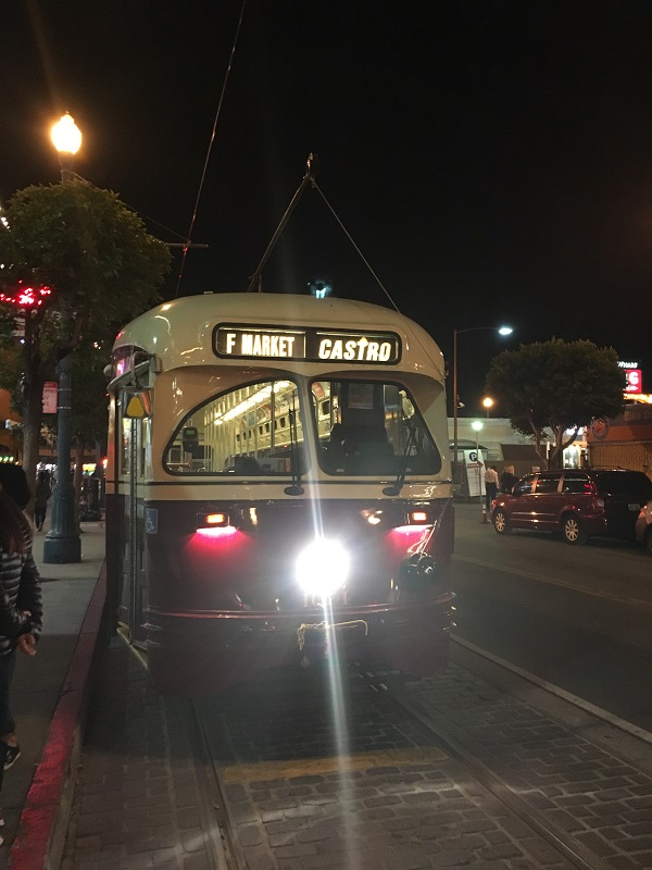 The Shell Building is at 100 Bush St. It was built in 1929 and occupied by Shell Oil Company until the 1960s. It features Art Deco and Modern Gothic architectural styles.The TransAmerica pyramid was completed in 1972, and has been the tallest building in the city since then (48 floors). It is soon to be surpassed by the Salesforce Tower that is under construction, though. (Note : the straight lines on the building edges are bent slightly by the wide panorama angle of my phone’s lens).I like the clean modern lines of the Umpqua Bank’s flagship building in San Francisco, on 450 Samsone St. It opened recently, in 2013 and features mobile concierges inside, iPads, interactive touch screens, outdoor seating and a free “loaner” bike.Here’s the street car that I took to Fisherman’s Wharf to get back to my hotel from the office.