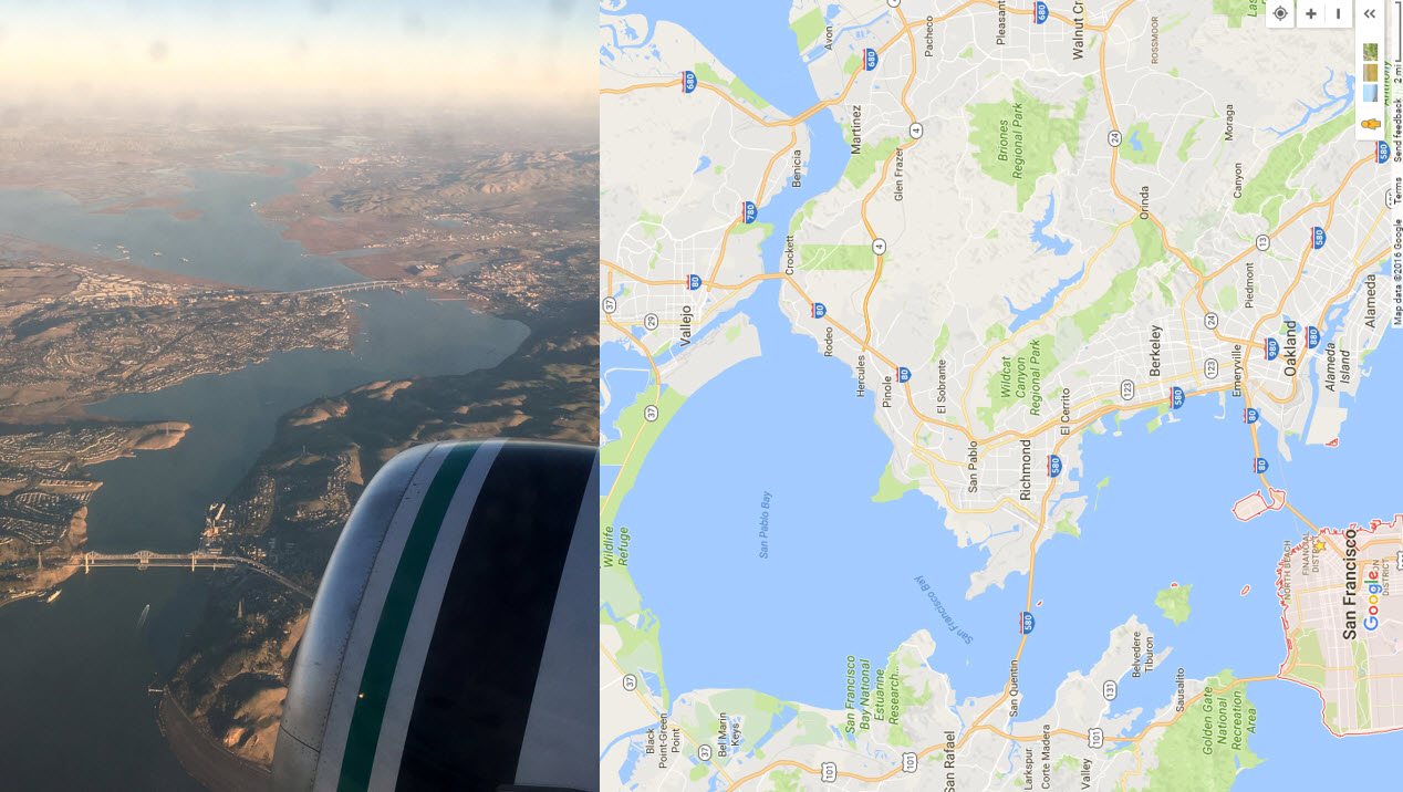 I turned the map of San Francisco Bay (on the right) and San Pablo Bay (on the left) sideways, so that it matches the eastward view from the airplane. The bridge in the foreground is the Carquinez Bridge, and the one further in the distance the Benicia Bridge.