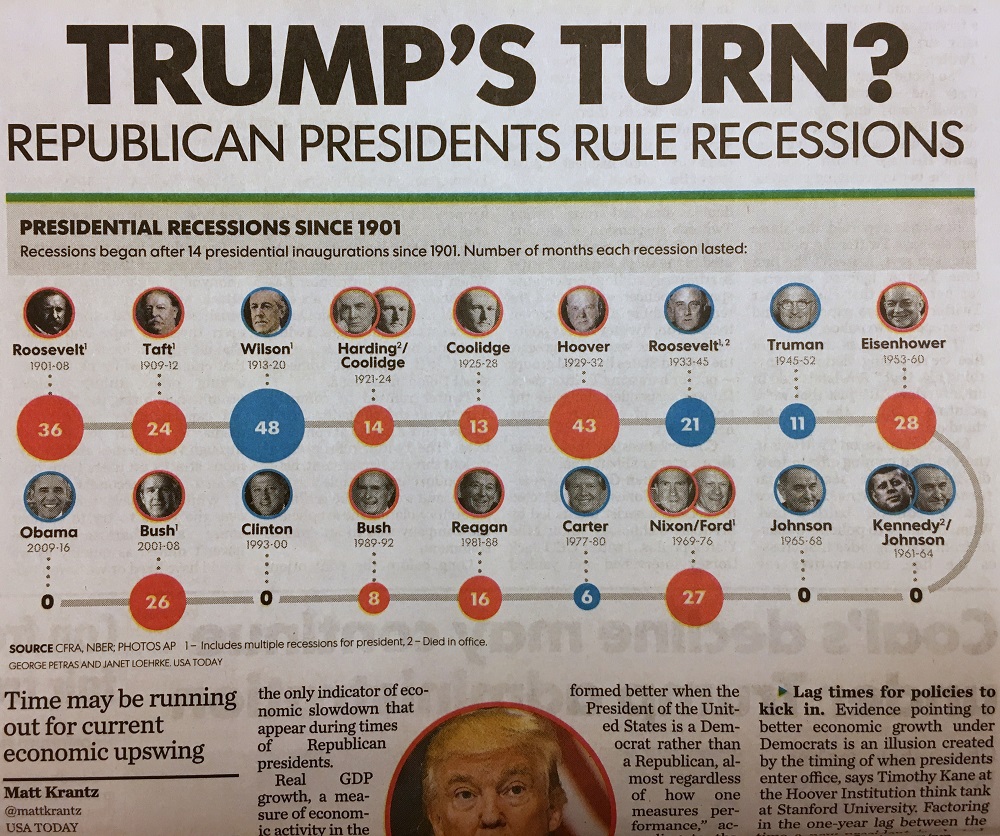 The stock market closed at an all-time high on Wednesday with the Dow Jones crossing 19,000 for the first time this week. So how come the USA Today of Tuesday raises the possibility of the R word (R for recession)? Besides, a recession may or very well may not happen the next four years, writes Barry Ritholtz in Bloomberg View column of Oct 14 – ‘The present U.S. economic cycle is a long slow recovery from a deep recession that started in December 2007 and was aggravated by the credit crisis of 2008-09. The Wall Street Journal said the expansion “has now continued for 88 months, making it the fourth-longest period of growth in records stretching to 1854.” But expansions don’t just get old and die; something fundamental has to happen to arrest the progress. And remember, records get broken all the time’.