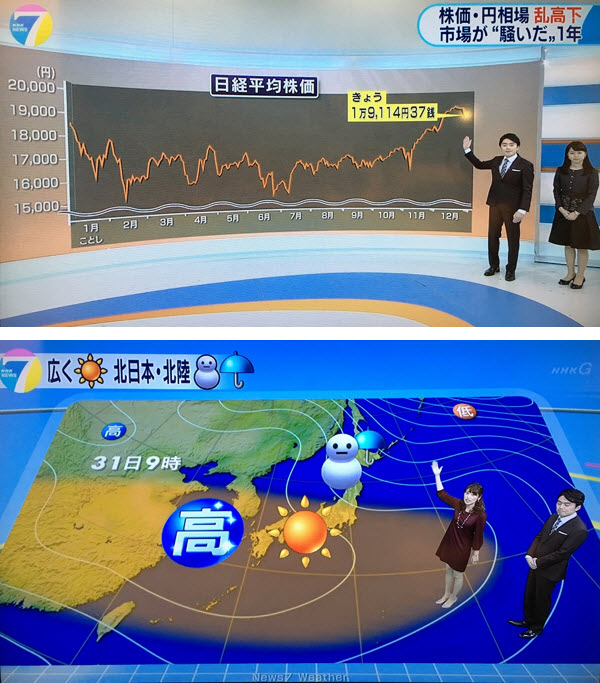 This beautiful building is nearby the Meiji shrine, and houses administrative offices. (The copper cladding on the entrance canopy has turned green).This is in Shibuya. The tear-dropped shaped kōban (police box) on the left is unusual. Usually they really are ‘boxes’!Half-boy, half-bird face on an advertising display panel at the entrance of a Virtual Reality arcade in Shibuya. Judging by the clientele inside, I was wa-ay too old to go in (but I did, anyway).Inside Shibuya station.The more mundane platforms on the old Ginza line that I use to get to Kyobashi station by the hotel.Display panel by the door inside the train car on the Ginza line. The program generating the display not only ‘knows’ which line the train is on, it also knows which CAR of the train it is in, and displays precise directions of connecting lines and how to exit the station.It was the Year of the Monkey, so the stock market went up and down, said the news reader at the final day of trading on the Tokyo Stock Exchange. And weatherwise it is not warm, but at least sunny here in Tokyo. Six days ago there was a massive snowstorm north in Sapporo, trapping hundreds of Hongkongers in Sapporo and sparking violence at the airport that needed police attention.
