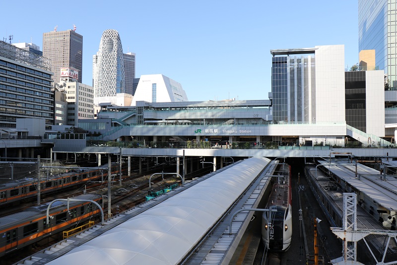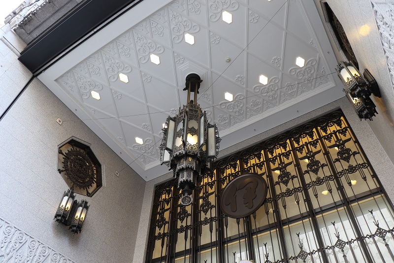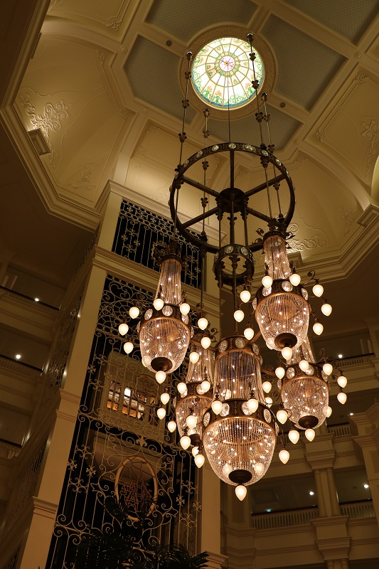 Here is the beautiful fixtures from the Isetan department store in Shinjuku, considered to be one of the most influential department stores in Japan.One of several display frames with merchandise inside Isetan .. or is it art? Both, I’m sure. For once, I was not inviting trouble by taking pictures inside the store : there is a sign that says ‘OK to photograph’.Shinjuku station is nearby, and I went upstairs to look down at it .. and lo and behold, there is the Narita Express (on the right).Here is the Tokyo Disneyland Station stop. The train runs in a loop, on a monorail, and the windows have mouse-ear silhouettes. (That would be Mickey Mouse, of course).This is inside the main lobby of the Tokyo Disneyland hotel. I have never seen such an enormous chandelier! Those are hotel rooms in the background.