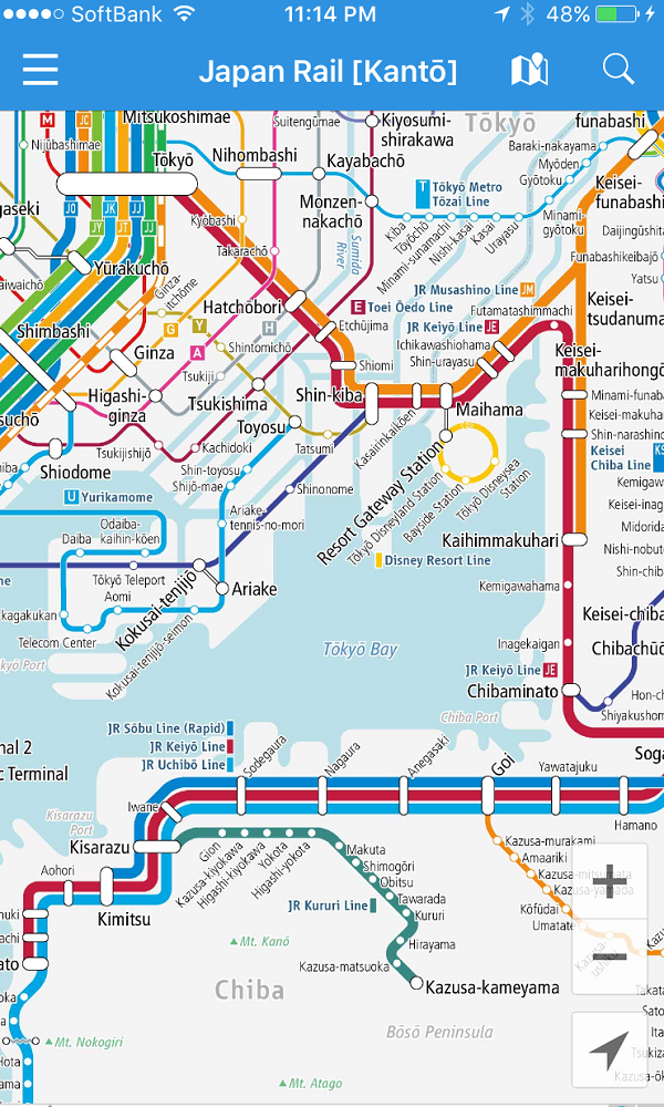 The Keiyō Line, run by Japan Rail East, runs out to Tokyo Bay. (I am close to the Tokyo station, the long bar on the top left). The Disney Resort line is a loop that runs around the Disney premises.