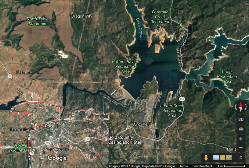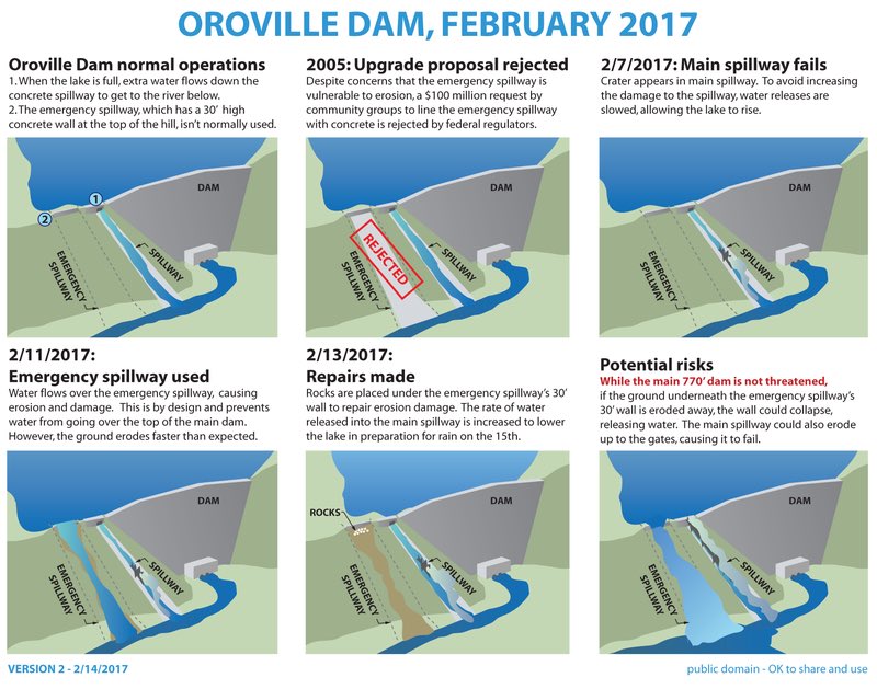 At some point more than 100,000 residents downstream from the dam wall were given emergency evacuation orders, with officials fearing the erosion under the emergency spillway may cause the natural wall next to the man-made wall to break. Emergency repairs were done on the spillways this week (basically helicopters and trucks dumping rocks and soil into the eroded areas), and for now, the emergency seems to have been staved off.