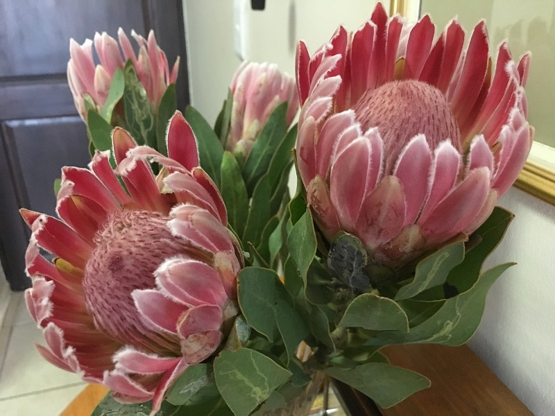 I found these proteas for sale when I was out at the mall on Saturday. Protea is both the botanical name and the common-use name for a large group of flowers found in the Cape Town area and on the slopes of Table Mountain. They are named after the Greek god Proteus (who could change his form at will), because they have such a wide variety of forms.