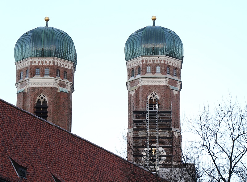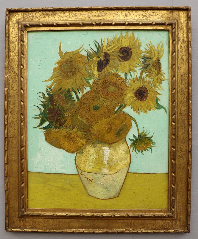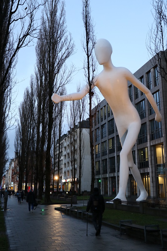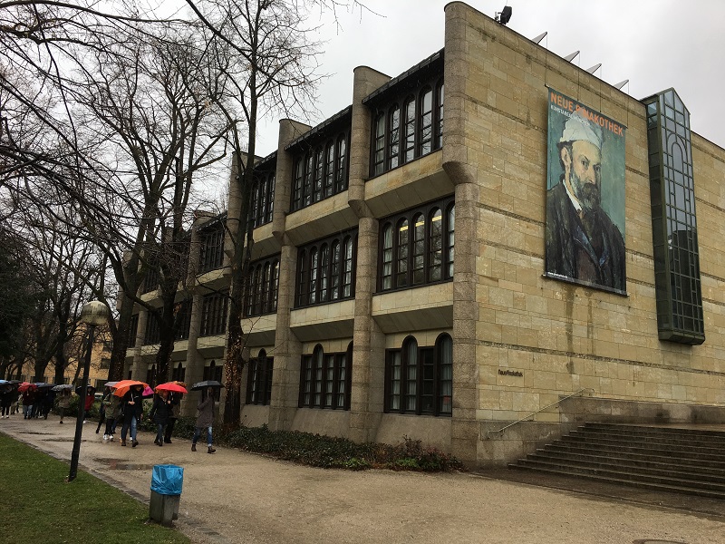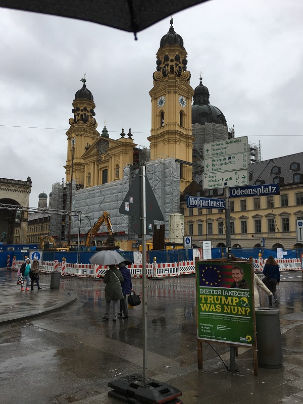 Here’s a wet Odeonsplatz – a large square in central Munich. That’s the Theatine Church in yellow, getting renovated, and a ‘Trump, What Now’? poster in the foreground.The entrance to the Neue Pinakothek, a museum with European works of art from the 18th and 19th century, some four blocks from Odeonsplatz. A student tour group is approaching on the left, umbrellas and all.One of the prize items in the Neue Pinakothek collection is the Van Gogh Sunflowers (Arles F456). Van Gogh painted several similar sunflower stills in two series. This one is the only one with a blue-green background. There are also a few Monets and Gustav Klimts in the museum, and a sculpture by Picasso.Here are the trains on the U3 & U6 lines by Odeonsplatz station. The train on the right is an older model, and the one on the left a brand new train.The rain finally cleared late on Thursday, just as I was getting ready to call it quits and go back to the hotel for dinner. These are the twin dome towers of Munich’s iconic Frauenkirche. The church building was completed in 1488, and the Gothic Renaissance domes in 1524.No, giant aliens have not landed in Munich! This 17 m (54 ft) tall ‘Walking Man’ artwork has actually been here on Leopoldtstrasse since 1995. It was designed by American artist Jonathan Borofsky.