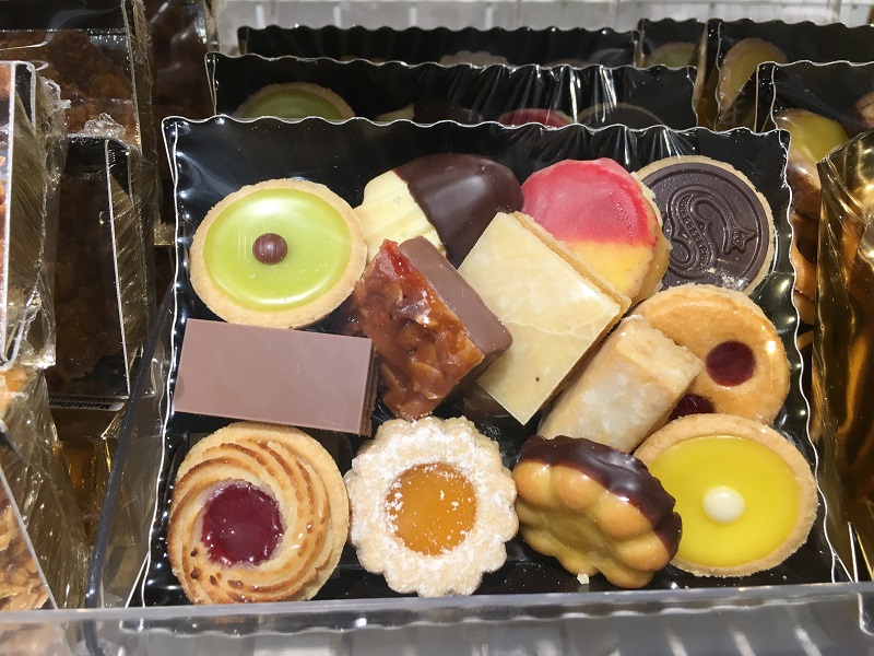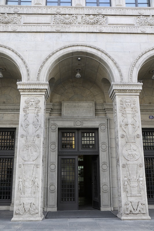 This is a little square called Paradeplatz. The building on the left is filled with Credit Suisse offices, and the building on the right has a Hermes store at the ground floor, and a beautiful golden balcony rail at the top.Here’s the entrance to the Swiss National Bank building. They did not sell Swiss coin sets (and the Swiss Mint is in Bern), but the teller was nice enough to change my 20 Franc note into relatively new coins of each denomination.Here’s a few Swiss Franc banknotes and the Swiss Franc coins. The Swiss Franc (SFr.) is just about on par with the US dollar, in value. There is also a SFr. 200 and SFr. 1,000 note. (Would love to get my grubby paws on a stash of SFr. 1,000s to admire! – but my last name is not Rockefeller). The SFr. 50 bill is new, the first of the 9th series of Swiss notes, and said to be the world’s most secure note, with 18 security features. There is no Swiss ‘penny’. (Should the US Federal Reserve take notes? Do away with the US penny, and maybe with the US dollar note as well?).There seems to be a chocolate store on every block in the city of Zurich. This one sells a dozen different kinds of ‘schokolade spröde’ (chocolate sheets). The light brown one in the middle has almonds in.Can life get possibly any sweeter than this little tray of chocolate, custard and jam cookies? This is from the fancy Jelmoli department store on Bahnhofstrasse.The museum for the day that I wanted to go to was the Museum für Gestaltung (Museum of Design), but it unfortunately it was closed for renovation until May. These posters are from the little park across from the Museum.All the street cars (trams) I have seen here in Zurich look like these ones .. two to four cars are connected, and they come by every 10 minutes. Motor cars seem to stay mostly out of the tram lanes, but on occasion they do use it.