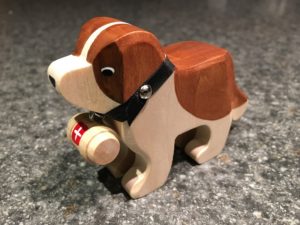 The St Bernard with the keg is hand-carved from sustainable Swiss limewood. It was made in the village of Brienz that has a long wood-carving tradition.