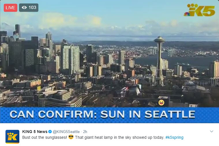 This February and March have been the wettest in at least a century here in the Pacific Northwest. So when the sun came out today, our local TV station tweeted this tongue-in-cheek picture of a sun-lit downtown Seattle. And as I walked into my kitchen late afternoon to start with dinner, I thought Whoah! The sun is so bright!