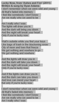 but sometimes I click up and down through the channels just to see what is on. On Friday night I stumbled again onto ‘This is 40’ (2012, directed by Judd Apatow). I knew that after all a lot of interpersonal relation-ship chaos, the movie would end with a great scene where Pete and Debbie (Paul Rudd & Leslie Mann) go out to find some live music, and that it would be Ryan Adams singing ‘Lucky Now’. So I patiently waited for the movie to reach the end, so
