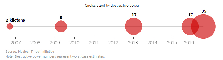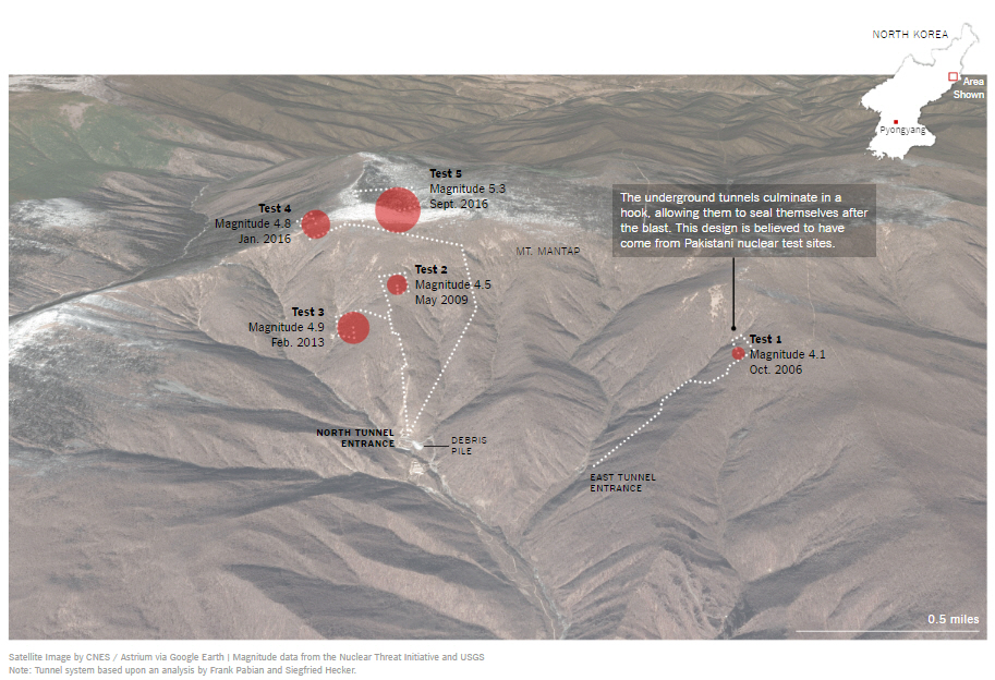 North Korea has conducted 5 nuclear tests the last decade, and all signs point to a sixth test this weekend. (This April 15 marks the 105th birth anniversary of Kim Il Sung, North Korea’s founder). The New York Times points out in an article with a lot of technical detail, that the North’s detonations generate shock waves that register around the globe. Mount Mantap is the only active nuclear testing site in the world. China is reportedly exerting a lot of pressure on North Korea (Kim Jong-un), trying to dissuade him from going ahead and escalating the tensions further. ‘If China does not take care of it, the USA will’ declared President Trump. But surely, analysts say, that cannot mean a pre-emptive attack on the nuclear facilities in North Korea. And South Korea would have to sign off on any military action, given that Seoul is just across the border.