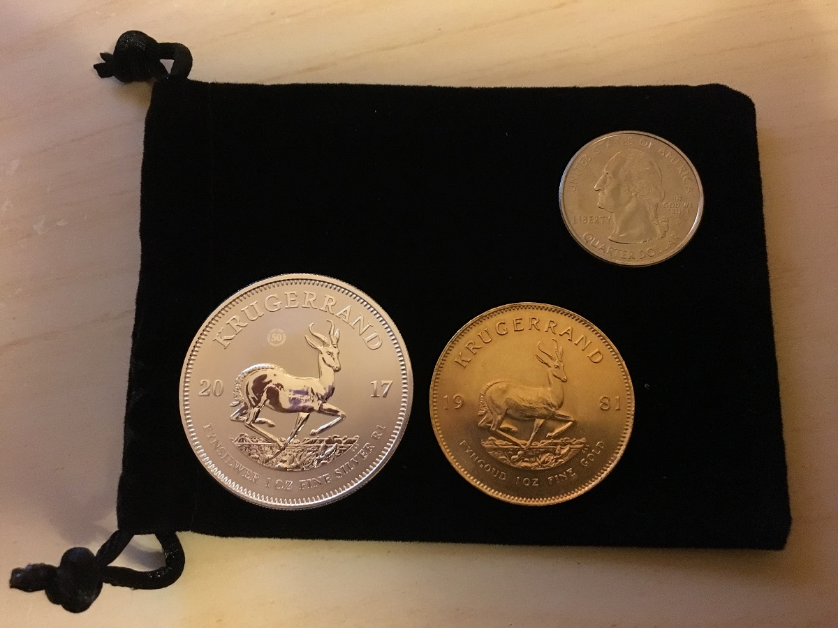 The 1-oz. fine silver Krugerrand is larger than the 1-oz. fine gold one. The specific gravity* of silver is only 10.31, while that of gold is 19.32. (That’s an USA quarter dollar coin in the upper right corner, for reference). *Indicates ‘how many times heavier than water’ the substance is.
