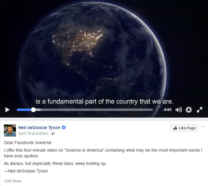 P.S. Check out astrophysicist Neil deGrasse Tyson’s four-minute Facebook video on the history and current state of science in America. ‘Science is a fundamental part of the country that we are’.