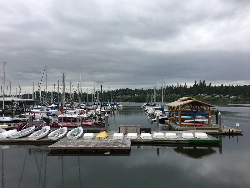 We’re pulling away from Edmonds for the Edmonds-Kingston ferry crossing.The marina at Kingston on Monday night. The dinghies in the foreground may have been cleaned and need to go back onto their respective yachts or boats, The Kingston ferry terminal is immediately to the left of the marina, and on the right is Appletree Cove.