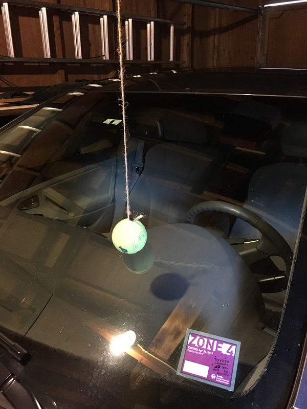I’ve been wanting to do this for a long, long time, and now I finally did it: installed an old tennis ball on a string, dangling from a rafter in my garage.
