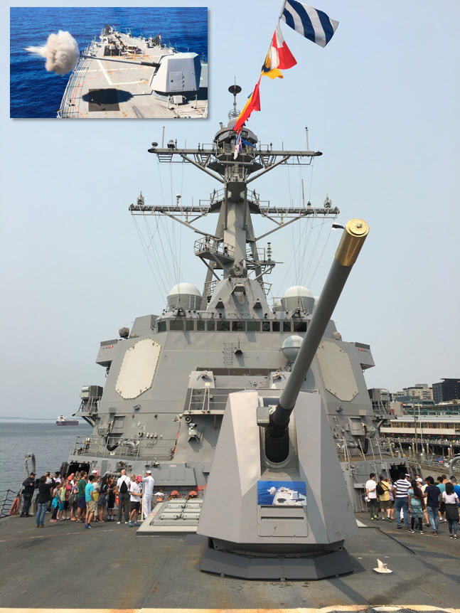 The USS Michael Murphy is an Arleigh Burke class destroyer with guided missiles, heavy artillery guns and up to three helicopters. (Seattle to Bainbridge ferry in the background). She was named in honor of Navy SEAL Lt. Michael Murphy, posthumously awarded the Medal of Honor for his heroic actions in Afghanistan on June 28, 2005. The USS Michael Murphy was commissioned in Oct 2012. The ship is ‘dressed up’ for display, with the colorful flags and pennants from the bow to the main tower and back to the stern. At sea, the flags and pennants can be used one at a time, or in combinations to send visual messages to other ships or aircraft.This is inside one of the helicopter bays. Everyone on the ship is a firefighter. Any sailor must be able to get fully dressed in two minutes, and at the fire in five. Everything stowed on the racks is tied down, of course.The view from the bow to the main tower. The radar equipment is behind those light patches. The main gun with the bronze cap is a MK 45 5-inch 62 caliber gun (inset picture shows it firing). The square hatches on the deck right behind the gun is where the guided missiles will come out, vertically, until it is far enough from the ship to start honing in on their targets.This is the quarterdeck, where visitors first set foot on the ship, and are signed in to the visitor’s log (at the back). The four posts on the corners of the colorful mat, are partly made of empty shells from the 5-inch gun.We were handed out this little pamphlet that highlights Washington State’s naval history.