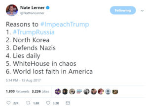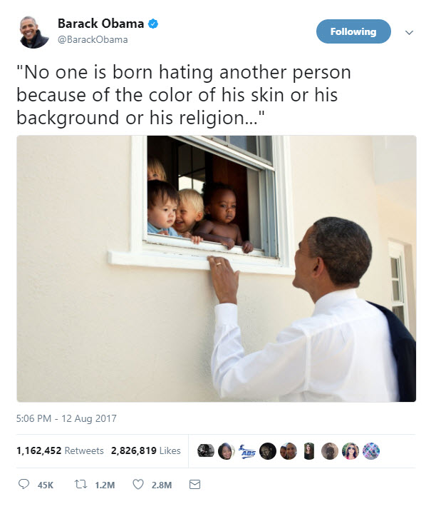 I like this tweet .. (Hurry up with that investigation into the collusion with Russia, Mr Mueller. There are so many reasons to impeach this President, but Russia is at the top of the list)... and this one. “No one is born hating another person because of the color of his skin or his background or his religion. People must learn to hate, and if they can learn to hate, they can be taught to love. For love comes more naturally to the human heart than its opposite.” – Nelson Mandela