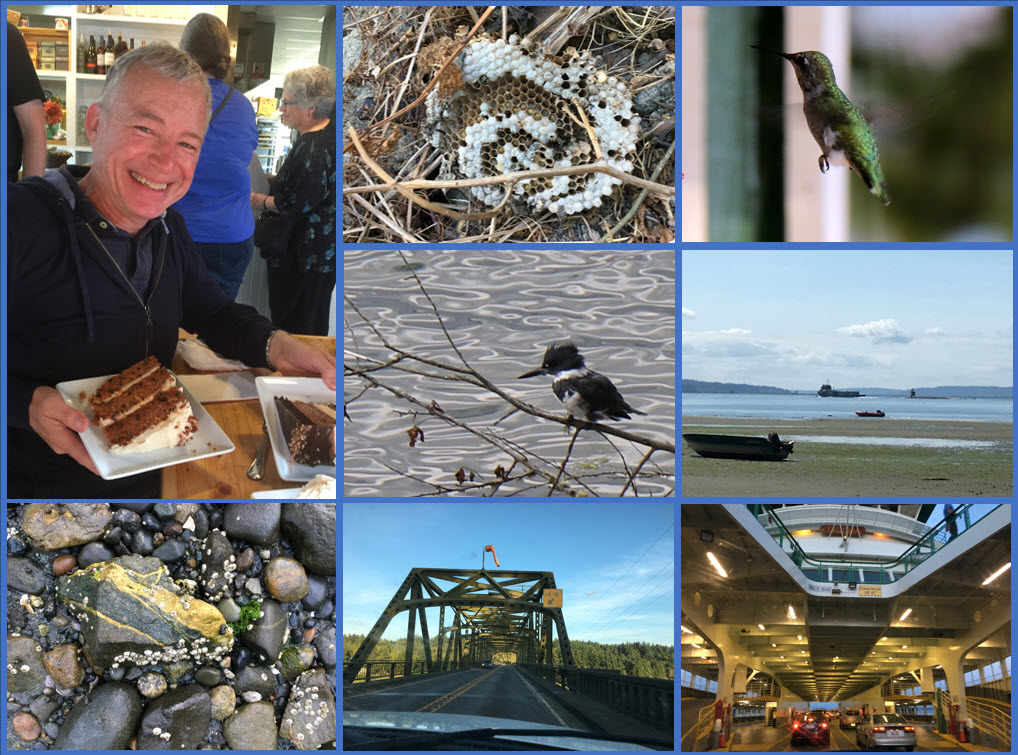 Clockwise: Carrot cake for my birthday, from Butcher & Baker Provisions (restaurant in Port Gamble); neat hexagon array in a yellow jacket wasp nest – unoccupied!; hummingbird, approaching feeder; submarine (far right) escorted to Naval Base Kitsap, during low tide on the Hood Canal; driving onto the ferry at Bainbridge Island terminal; Agate Pass bridge onto Bainbridge Island (see map); pebbles on beach by Hansville; belted kingfisher on same beach (I need a stronger zoom lens!).