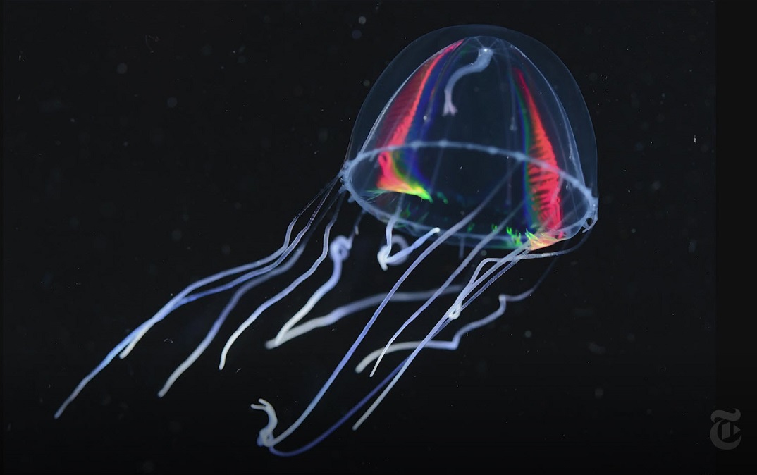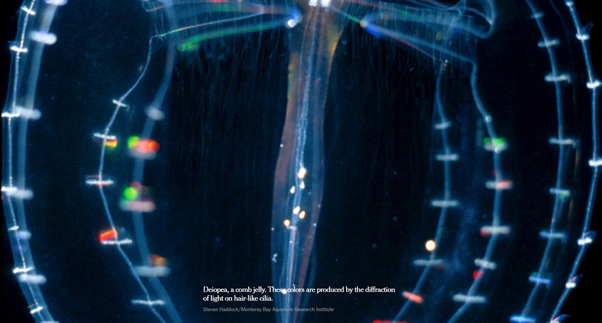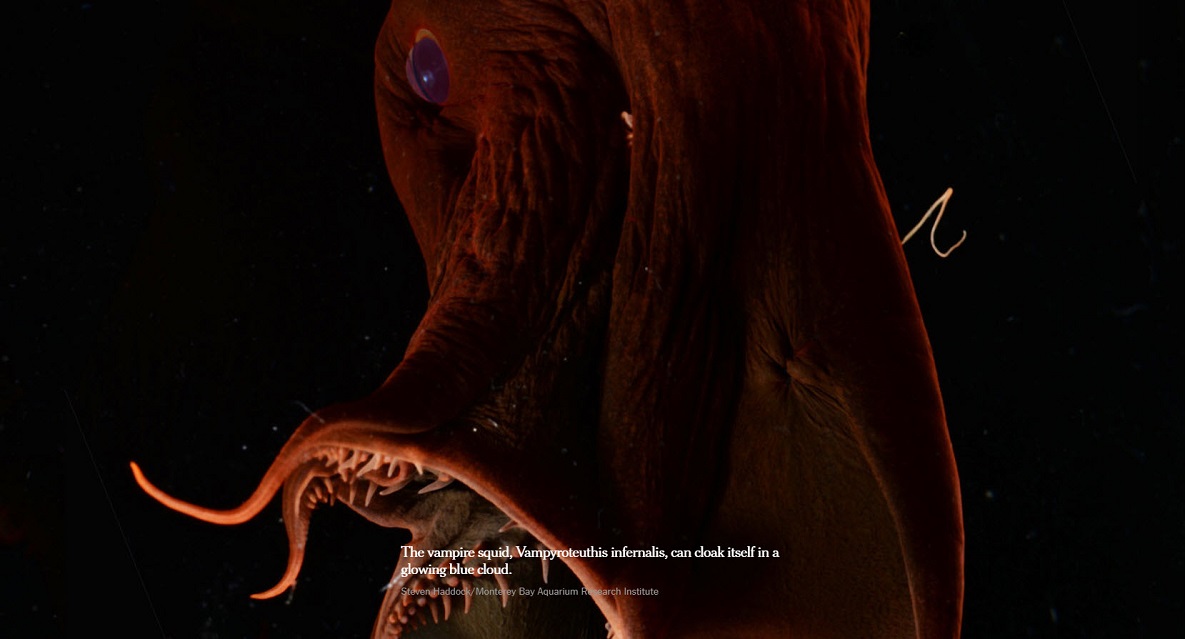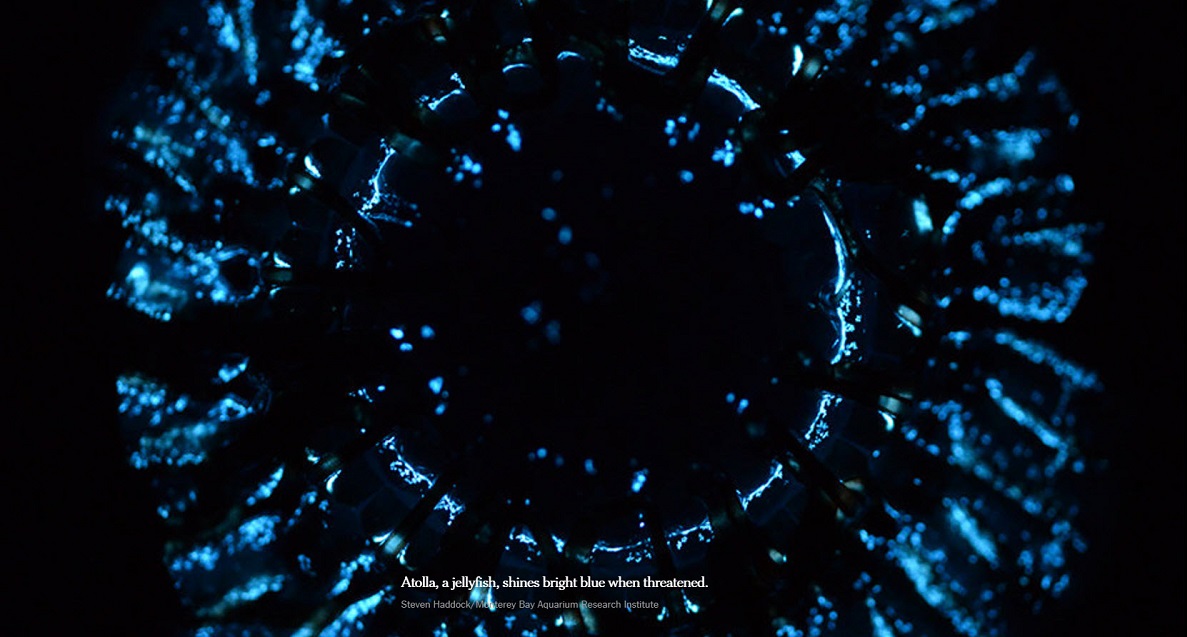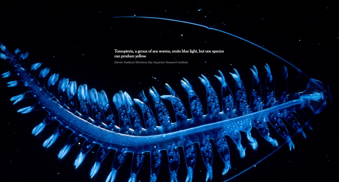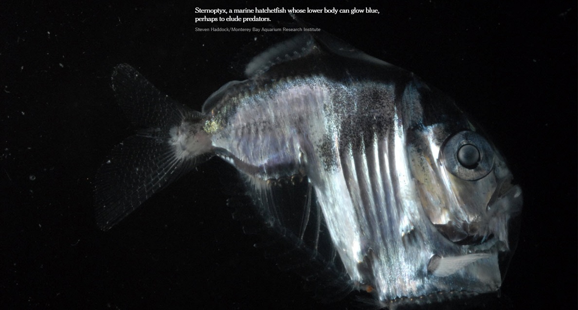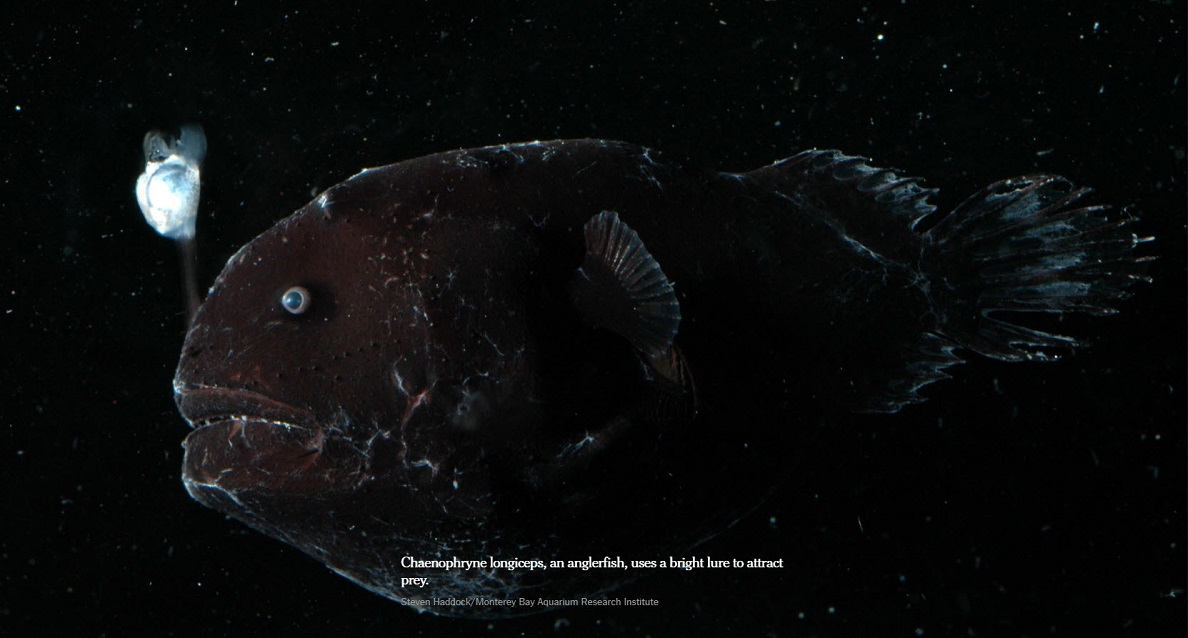 This New York Times article points out that creatures of the deep sea use light much as animals on land use sound — to lure, intimidate, stun, mislead and find mates. I love the pictures of the creatures.