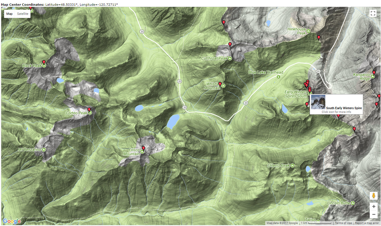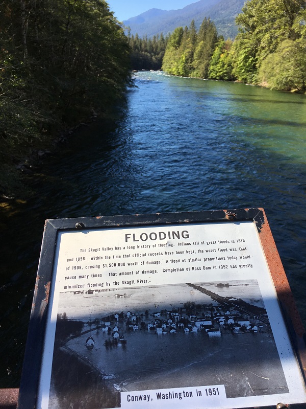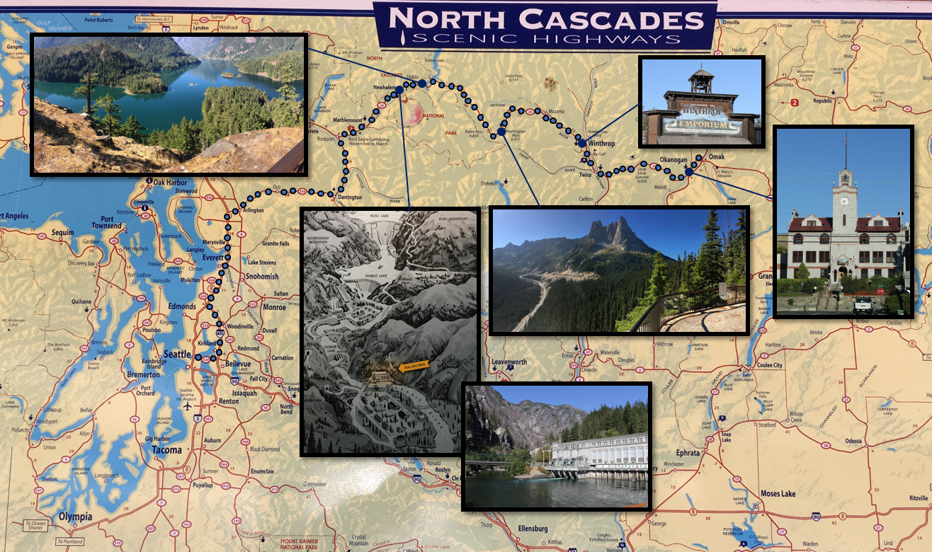 Clockwise from top left: view over the Skagit River Valley, with the Diablo Dam’s dam wall directly ahead; vintage ‘Wild West’ storefront in Winthrop; town hall of Okanogan; viewpoint in Washington Pass on Highway 20, with the Early Winter Spires (7,807 ft / 2 380 m); at Newhalem by the Gorge Dam and Power station; the diagram shows the Ross Dam and the Diablo Dam as well.Here’s a cool topographical map that I generated with a Google search for ‘Early Winter Spires’ that shows how Highway 20 follows the lowest contour lines through the North Cascades. The web site is http://www.summitpost.org. There is a hairpin bend in the road by the Spires, and the map also shows several alpine lakes. These are lakes or reservoirs at high altitudes, usually starting around 5,000 feet (1,500 m). These is still snow and ice visible further up, from small glaciers. Highway 20 gets so much snow in winter that it is completely closed for traffic, sometimes only opening again as late as June.View from a foot bridge overlooking the Skagit River at Newhalem; this is just downstream of the Gorge Dam. Flooding in the Skagit Valley has become a rare event due to the three dams that had been built upstream in the Skagit River (the Gorge, the Diablo, the Ross).
