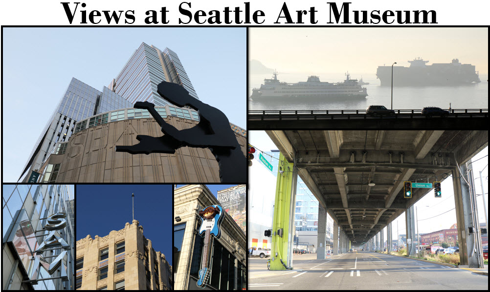 Clockwise from the top left: Hammering Man outside SAM was designed by Jonathan Borofsky and installed in 1992 | a big old containership tugged into the Port of Seattle just as the Bainbridge Island ferry was leaving, viewed from the Four Seasons Hotel street level | under the Alaskan Way Viaduct whose days are now numbered -it will be torn down completely by fall 2019 | Hard Rock Cafe’s guitar | beautiful art deco detail on the Vance Building (completed 1929) | mirrored SAM lettering on the side of the building.