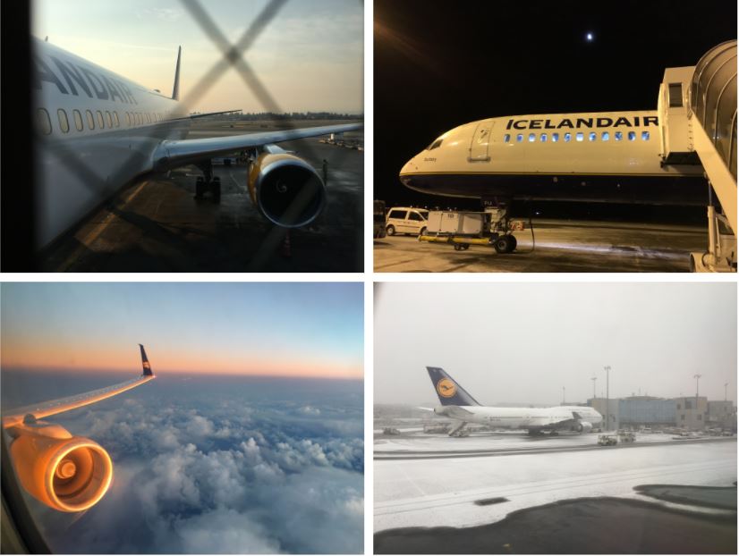 Clockwise from top left: Boarding Iceland Air’s Boeing 767 flying machine that took us to Reykjavik | Icy tarmac in Reykjavik as we board the ‘Surtsey’ Boeing 757 for Frankfurt. Surtsey is a volcanic island that appeared in 1963 south of Iceland. | Over Scotland, on the way to Frankfurt, flying southeast into the sunrise | View from the plane as we arrived in Frankfurt in steady, sifting snow that’s falling.