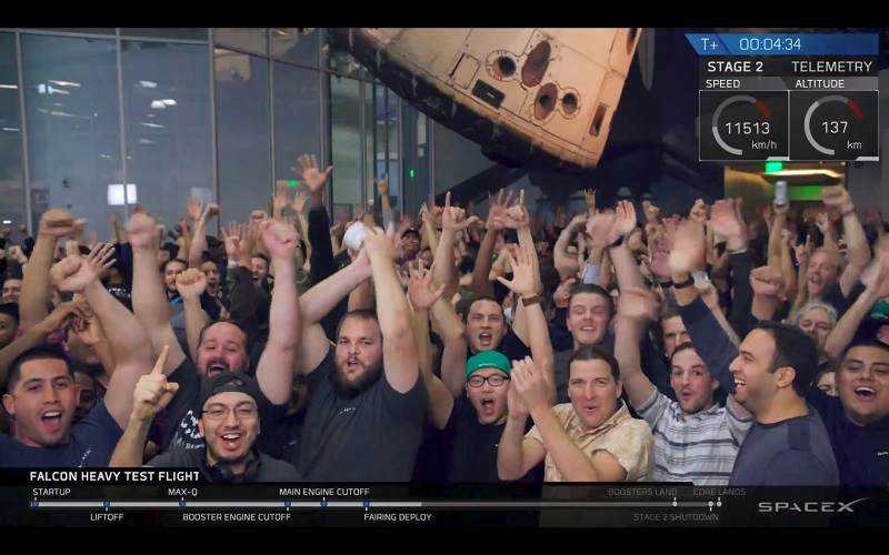 Here’s the lift-off of the Falcon Heavy rocket (cost: $90m). Rockets are about 85% fuel by mass. This is essentially a Falcon 9 rocket with two additional boosters strapped onto it. This was just a test flight, and there is a Tesla Roadster inside the rocket, with a dummy dressed up in a space suit (‘Spaceman’) driving it. Right here about 5 million pounds of thrust is generated, equal to the combined thrust of some eighteen Boeing 747 aircraft.I smiled when the live-feed camera panned over the ‘fan boys’ with their happy faces, as they cheered the lift-off. I think this is at the launch center in Cape Canaveral in Florida. P.S. Where are all the fan-girls? We need you, too, to become engineers.