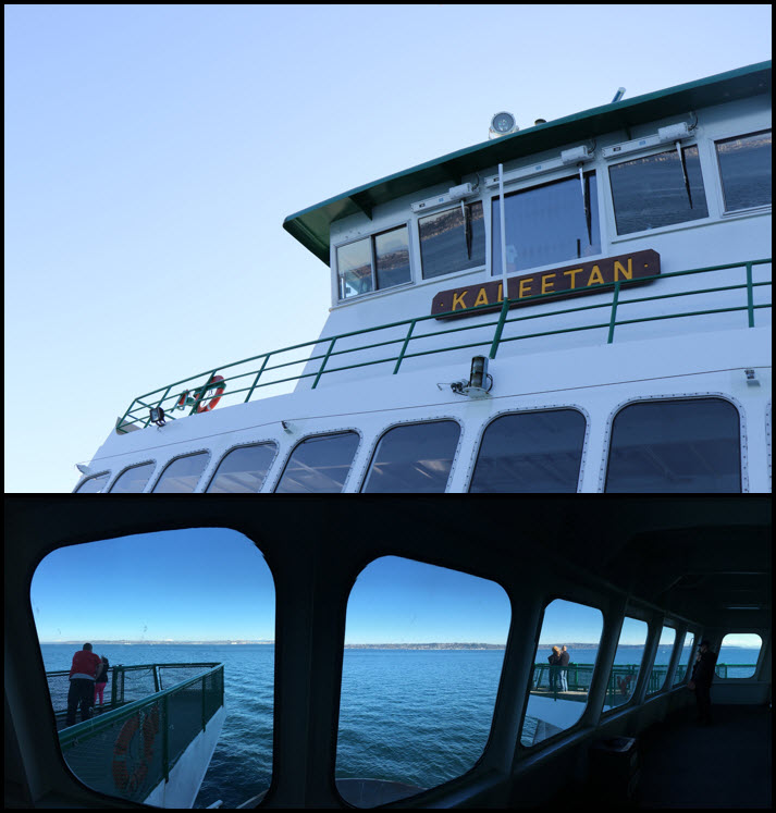 This is Pier 50 on the Seattle waterfront, and I am on the Bremerton-bound ferry called Chimacum (this vessel started service in 2017, 1500 passengers, 144 vehicles). The ferry in the picture is the Wenatchee (launched 1998, 2500 passengers, 202 vehicles). It is just pushing back from the terminal as well, going to Bainbridge Island. The sharp-looking, swank new building with the triangular faces, in the skyline, is the F5 Tower, also known as The Mark.This is outside the Naval Museum, the ‘sail’ of the Sturgeon-class attack submarine, the USS Parche (SSN-683). Commissioned in 1974 and decommissioned 2004, she is said to be ‘the most highly decorated vessel in U.S. history’. The letters and striping stand for awards such as Battle Efficiency, Navigation Excellence and Communication Excellence. Inset: USS Parche returns to port for the last time at Naval Base Kitsap at Bangor, WA on Sept 20, 2004. [Picture: WIkipedia]We had the ferry called Kaleetan on the way back from Bremerton to Seattle. She can hold 144 vehicles, and 1868 passengers; has been in service since 1968 and will be replaced in a few years.
