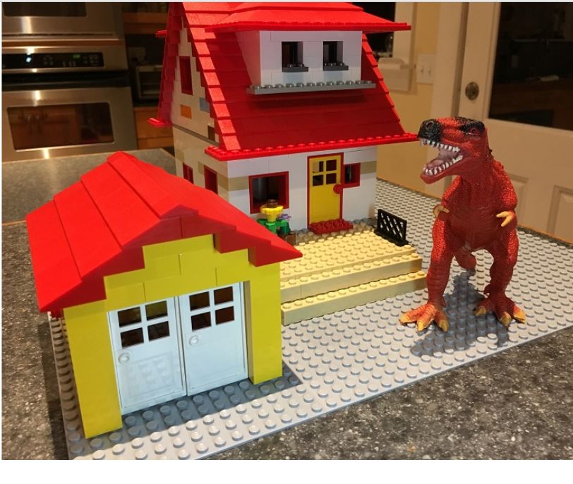 I did not buy the big T-Rex I saw at Toys-R-Us (my post a few days ago), but this red one at Walmart was on sale for just $1.97. Besides, the dinosaur – the terrible lizard * – goes nicely with the garage that I added to my Lego house. It’s all just for fun. I will eventually box up these toys and donate all of it to Goodwill.
