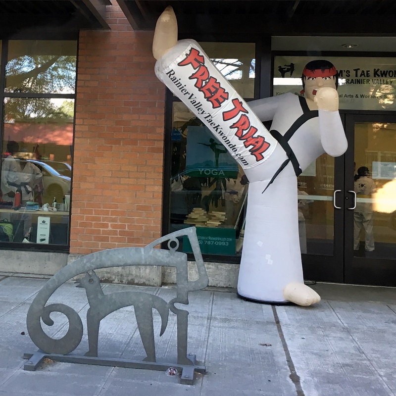 We drove by Kim’s Tae Kwon Do training studio on Rainier Avenue. Tae Kwon Do is a Korean martial art, with an emphasis on head-height kicks, jumping and spinning kicks. Check out the chameleon-and-doggie bike rack in the foreground. P.S. Good news from North Korea is that three detained Korean Americans have been released by North Korea just as Secretary of State Mike Pompeo arrived there to plan the summit of Kim Jong Un with President Trump.