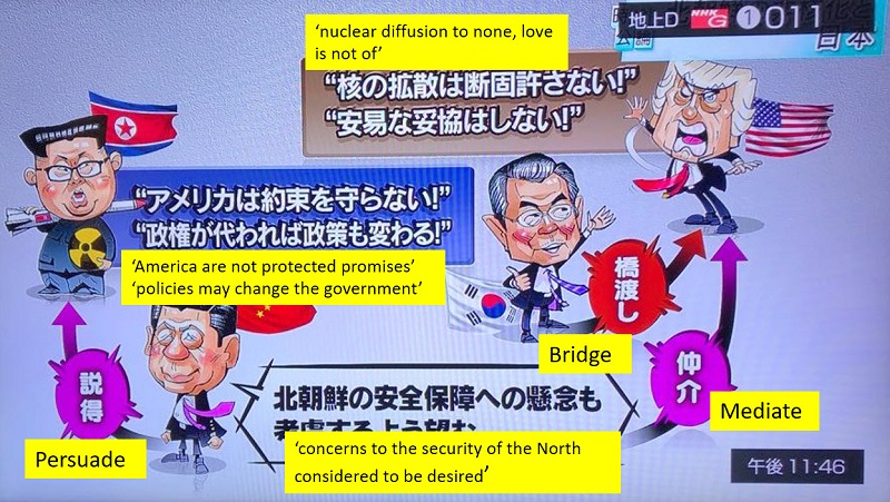 Check out this screenshot from Japan’s NHK TV. I love the cartoonist’s depiction of (left to right) a coy Kim Jong-un, a plotting Xi Jinping, a friendly Moon Jae-in, and a bombastic Donald Trump. I pointed my iPhone camera with Google Translate, onto the text in an attempt to translate the Japanese. The results are shown in yellow. The challenges to the Google Translator is probably a close metaphor for the challenges with the real negotiations, with regional interests and translators and all, in the mix.