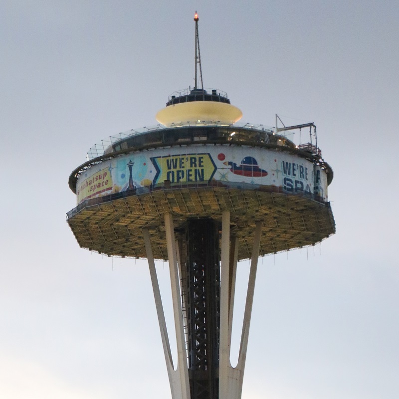 The top of the Space Needle on Thursday night at dusk. The new glass panel installation at the top is visible now, but the side scaffolding and bottom panels are still obscuring the rest.