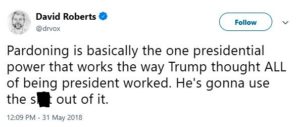 So Trump is using the presidential pardon power for revenge. Or even to signal to the criminals associated with him (think Micheal Flynn, Michael Cohen, Paul Manafort) that he will pardon them as well, in the event the Russia investigation finds them guilty. (Flynn has already pleaded guilty, as a matter of fact).