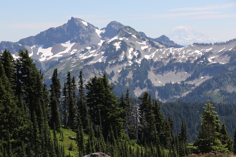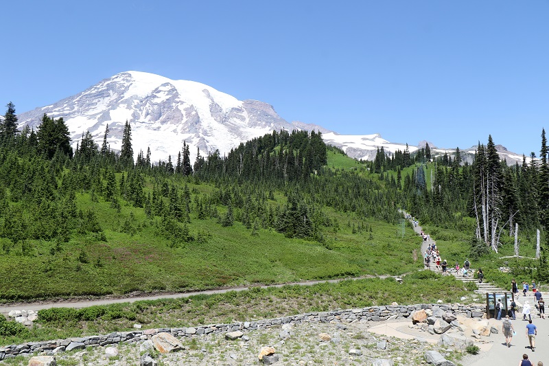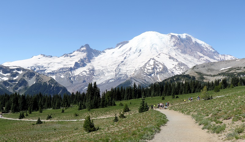 Mount Rainier is the highest mountain of the Cascade Range of the Pacific Northwest, and the highest mountain in the state of Washington. Elevation: 14,411′ (4,393 m). Last eruption: 1894.Glaciers are slowly moving masses or rivers of ice formed by the accumulation and compaction of snow on mountains (or near the poles). The Sunrise Viewpoint is northeast of the mountain, and Paradise Viewpoint to the south.This is the view of Mt Rainier and its summit, after walking up just a few hundred feet from one of the trails starting at the Sunrise Visitor Center. This is at 6,400 ft (1,950 m) elevation, the highest point that can be reached by vehicle at Mt Rainier National Park.The Alpine style day lodge at Sunrise Visitor Center.Here is the view of the mountain from the south, from the new Henry M. Jackson Visitor Center (at the Paradise Viewpoint). Elevation here is about 5,400 ft (1,645 m). The trail on the right goes up, up, up to where the brilliant green ends. The trail is very, very steep at its start, even though it does not look like it is. Further up, we found large patches of snow to step onto. With a lot of summer weather remaining, maybe a lot of it will still melt.A waterfall of melting snow on the rock face on the south side of the mountain. To the north face of the mountain, the Whitewater river springs from Emmons glacier – a milky white river, running very low at this time of year.This ‘paint by numbers’ view is found looking south, after we had walked up for an hour or so from Paradise Viewpoint. Look for the faint outline of Mount Adams in the distance, top right.A yellow sub-alpine flower that I don’t know the name of, with a happy bug on it.Mr Chipmunk saying hello. Chipmunks are small, striped rodents of the family Sciuridae, same as the one that tree squirrels and ground squirrels belong to. They hibernate in winter, but wake up every few days to feed on stored food (rather than fat reserves).Another wildflower from the Paradise Viewpoint. I will have to look for its name online!Here is the scary part of beautiful Mt Rainier, stratovolcano mountain that it is. A large eruption will result in debris flows (the red), and destructive mudflows called lahar further down (the yellow). It is amazing how far away from the mountain, communities alongside the rivers, and in the valleys, are at risk. The city of Seattle at the very top of the picture will come out OK, it seems (but Seattle has tectonic plates in the Pacific, and the economic fortunes of Amazon to contend with).