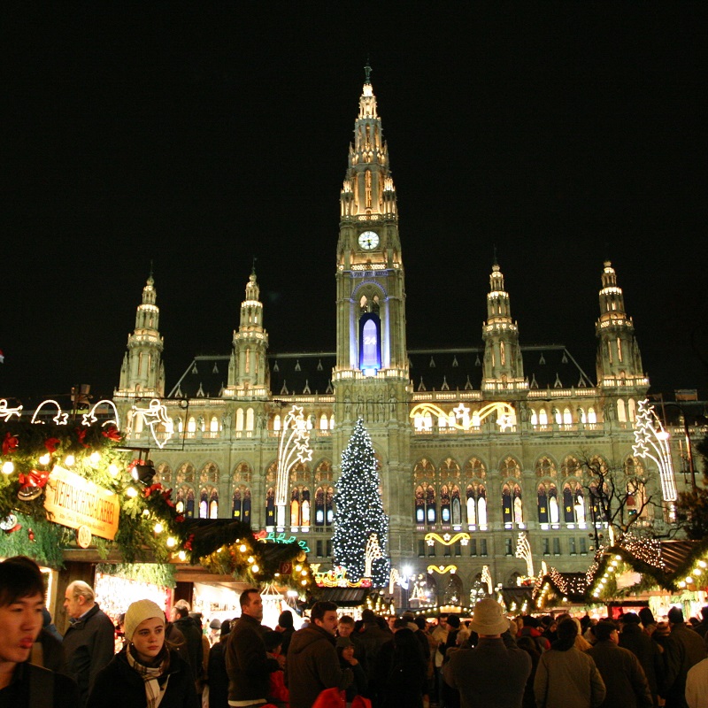 [Graphic from Die Burger newspaper] ‘Everyone wants to live in Vienna’. The grading of the cities were determined by Stability (25%), Education (10%), Health (20%), Infrastructure (20%), Culture and Environment (25%).Ah, Vienna: the City of Music. Here’s a picture I took in December 2008, of the majestic Vienna Rathaus (City Hall), all decorated for the Christmas market. (My colleagues and I were working in on a project Bratislava, Slovakia – just across the Danube river – at the time). We milled around with the crowds, and had some great glühwein!