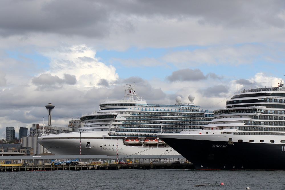 Fall has started, and the cruise ship season is winding down. (The last sailing from Seattle is Oct 10). Friends of ours left on a cruise this afternoon from the Smith Cove cruise terminal. Bryan and I went there to wave them goodbye – but we could not get quite close enough to the pier! We settled for views of the cruise ship departures from the Elliott Bay marina.