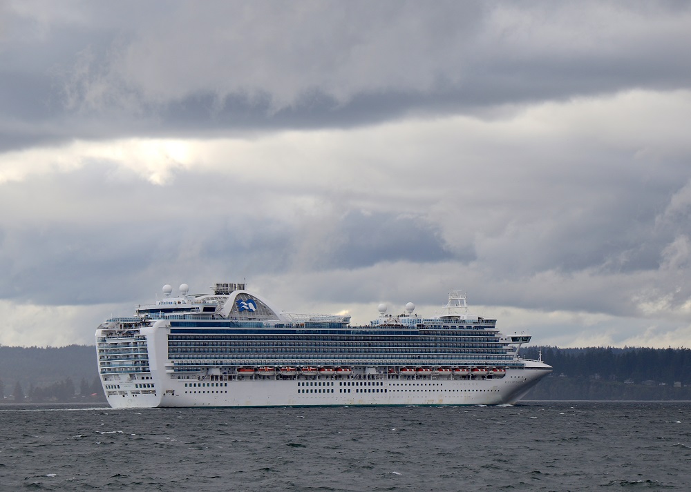 Our friends are on the Ruby Princess on the left (built 2008 for $400m; capacity 3,600 passengers). She was setting sail for San Diego. On the right is the MS Eurodam (built 2007; capacity 2,100 passengers). She was setting sail for Alaska.Here is the Ruby Princess shortly after she had set sail at 4 pm. She is heading north towards the Strait of Juan de Fuca, to get into the Pacific Ocean.