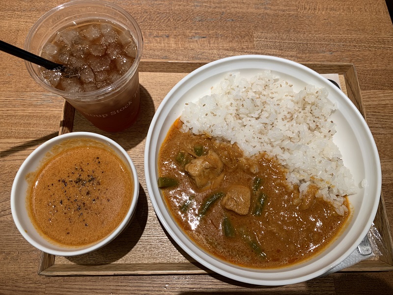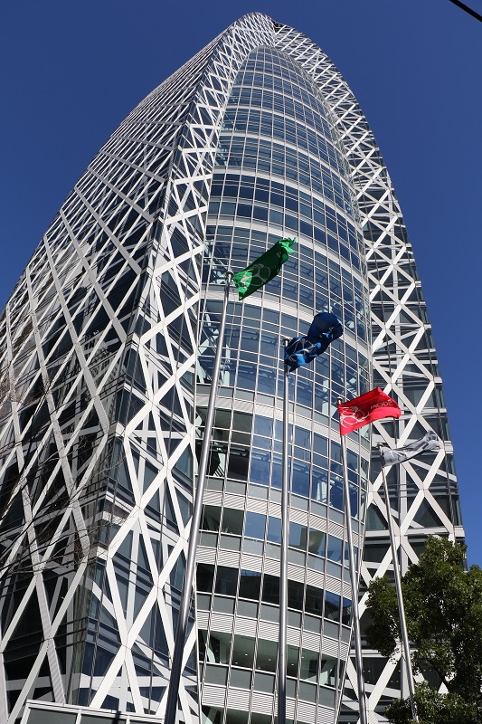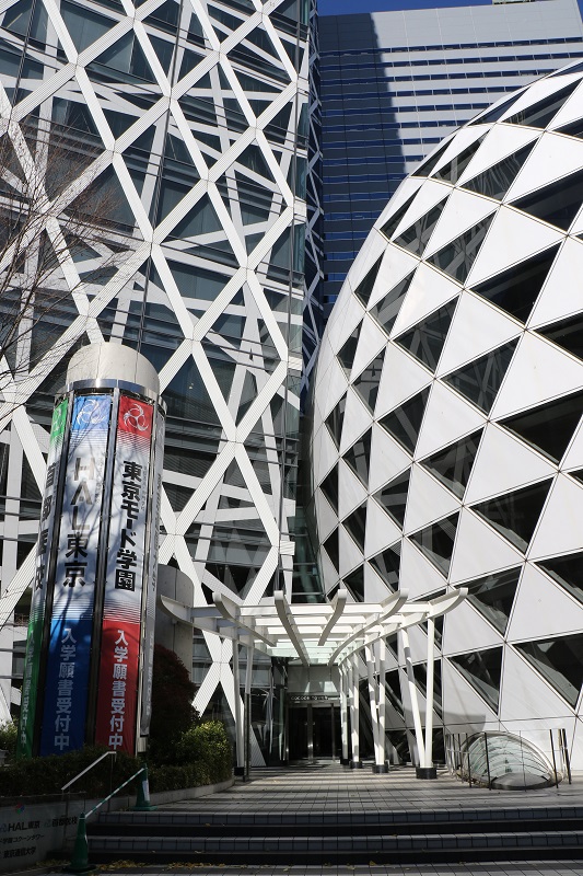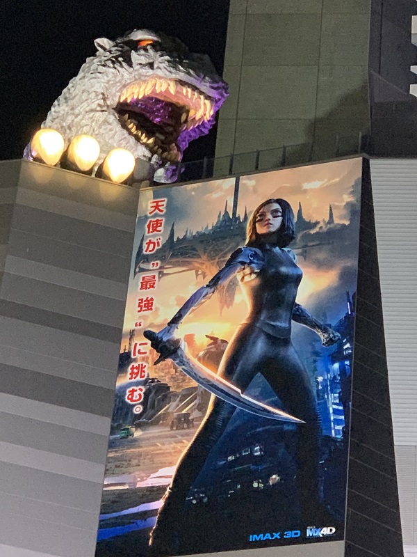 Here is the Shinjuku building of Kogakuin University (completed 1989, 29 floors). The blues and grays complement each other nicely.The Mode Gakuen Cocoon Tower is just across the street, and home to three educational institutions. Completed in 2008 and 50 storeys (204 m/ 670 ft) tall, its architectural style is called ‘Deconstructivism’. (The design brief called for a building that is anything but rectangular). The architect used white aluminum strips and dark blue glass to make the cocoon.Here is the entrance to the south of the cocoon. I guess the architect thought: oh well, we have a cocoon, why not throw in a geodesic dome at its base as well? ( ! ).Here’s lunch today, from a franchise called Soup Stock Tokyo. It’s chicken & veggie curry and rice, bisque soup and iced tea (with tiny cubes). It was spectacular .. I was SO hungry and SO tired as I sat down and scarfed it all up.Here is a street corner close to Shinjuku station decked out with billboards and neon signs. Shinjuku is a happening place on a Saturday night: beer halls, restaurants, pachinko parlors, karaoke bars, upscale stores and not-so-fancy stores, department stores and more.A colorful restaurant on one of the side streets. It was still early, so not many people in the street, but the hostess is ready to beckon them in. I suspect those scooters are for take-out food delivery.And here is a Godzilla installation at the IMAX movie theatre. I’m sure it is to advertise Godzilla King of the Monsters, due out in summer of 2019. The heroine with the sword must be from a different movie.