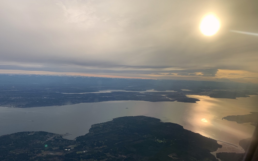 Here is our All Nippon Airlines 787 bird sitting at the gate at Narita airport. It left well after the sun had sunk below the horizon (Friday in Japan at 6.15 pm), and then flew almost due east for about 9 hours .... to meet the sun on the early side of the night we had left. Here we are starting the descent for Seattle airport, to arrive there at 10 am Friday morning Seattle time.