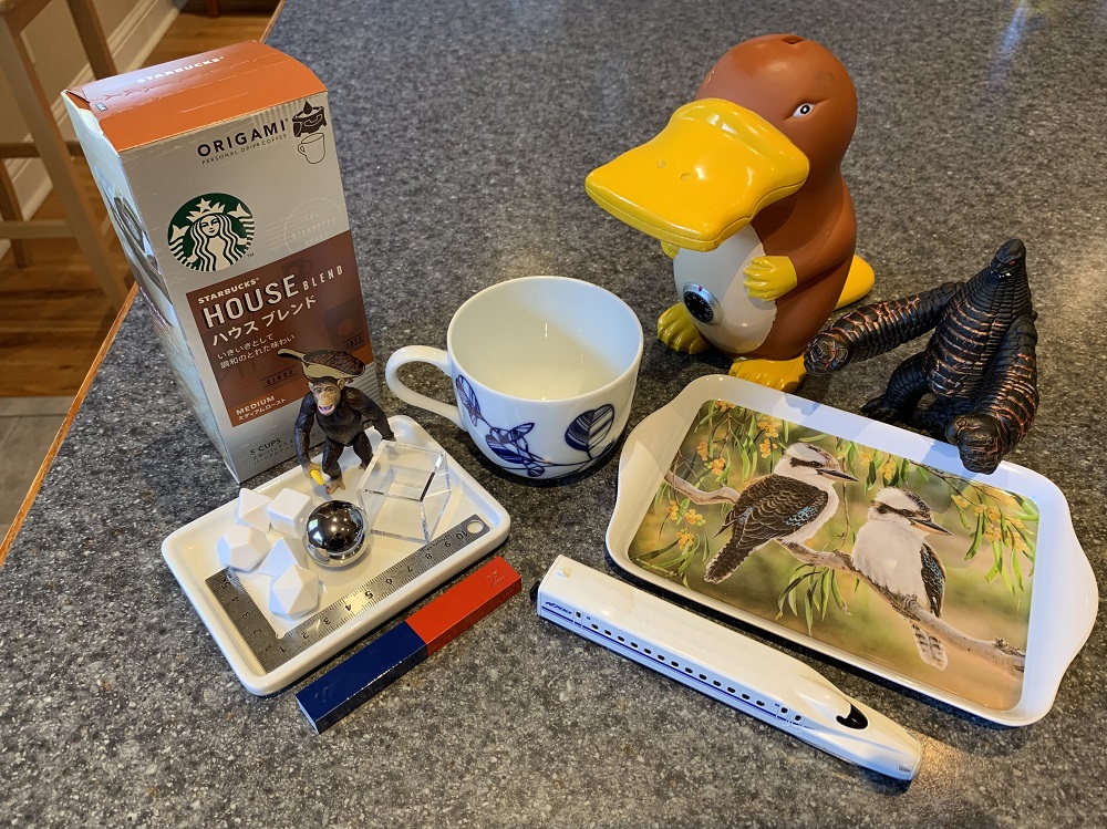 Clockwise: Red & blue north-south bar magnet (polar opposites, so a perfect metaphor for Republicans & Democrats in American politics, right?), mini set square, 28.57 mm steel ball & perspex cube, all these from Tokyu Hands store | white porcelain tray from Muji store | chimpanzee, banana in hand & white solid polyhedron set from Akihabara | origami Starbucks coffee filters | porcelain mug by Koransha (Japanese porcelain) | platypus piggy bank with ‘combination lock’ as a belly button from Commonwealth Bank | the ‘Red King’, an ultramonster with oversized fists (No 57 in the Ultraman series) | melamine tray with Australian kookaburras | diecast model of N700 series bullet train