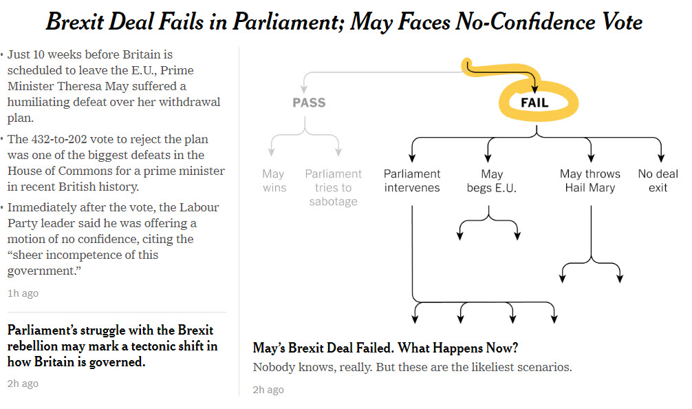 Now there is political chaos on both sides of the Atlantic, with the historic defeat of Prime Minister Theresa May’s Brexit deal in the House of Commons today – and with the United States Government shutdown deadlock dragging on to Day 26.