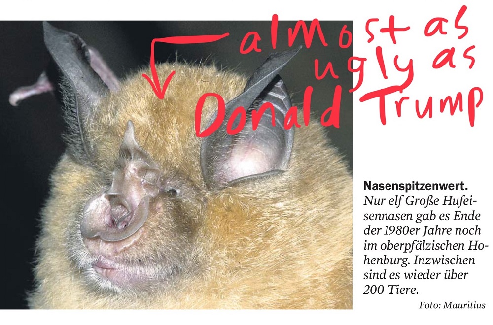 Photo from Der Tagesspiegel newspaper (I could not resist adding the red lettering). Translation: The Value of the Nose Tip. Only 11 Greater Horseshoe Nose Bats were found in the 80s in the Hohenburg area. Since that time, there are now again more than 200 animals’. The bat is about 12 cm (5″) with a wingspan of 35 cm (14″). The horseshoe nose is for generating beeps for echolocation (the echoes then picked up by their special ears, of course).