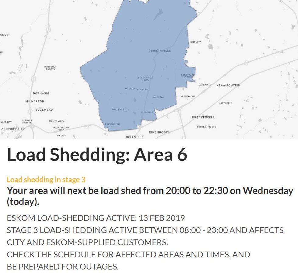 On Sunday, unexpectedly, the utility announced that it had to resort to Stage 3 Load Shedding mode, with widespread power outages. There were more on Monday, on Tuesday, and today. For Stage 3, Eskom implements rolling blackouts per published time periods and areas around the country, that forces a cut in the national power consumption by 3,000 MW. (About 10%. The country’s power consumption needs at this time of year is around 30, 000 MW).