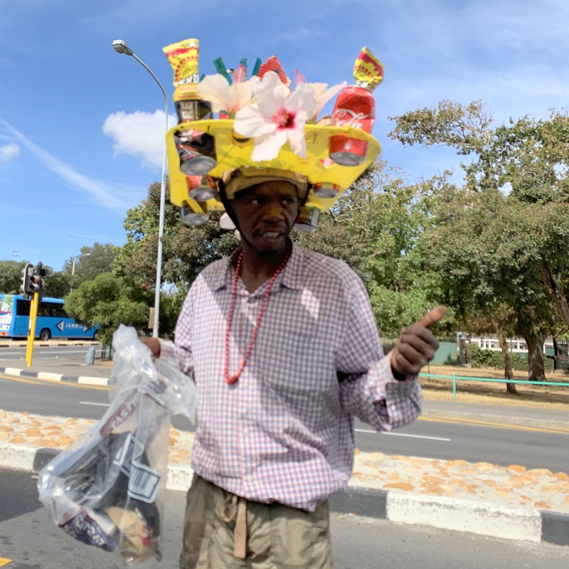 This guy at a traffic light stop in Rondebosch had a hibiscus flower in his ostentatious hat.