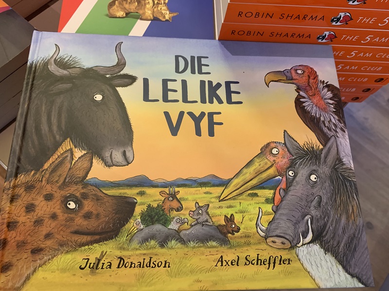 Here’s the entrance to the check-in and departure lounges at Cape Town International Airport. The rental car drop-off is close enough so that one can walk to the departure lounge – very nice.Children’s book with cute animal faces at the book store: ‘The Ugly Five’ (as opposed to the Big Five: lion, leopard, rhinoceros, elephant, and Cape buffalo). The ‘ugly ones’ on the book’s cover are the wildebeest, the hyena, the vulture, the Marabou stork, and the warthog.